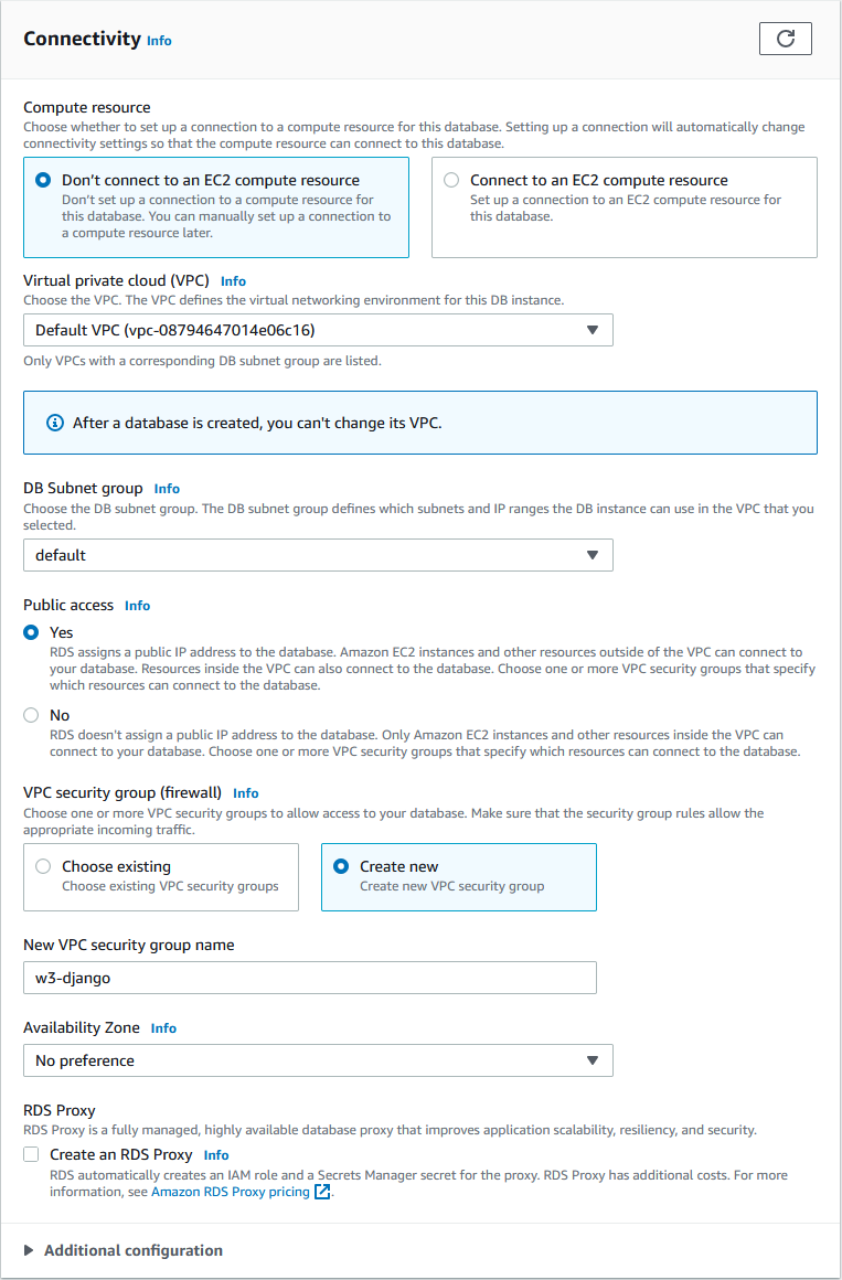 Inside the RDS service, create a database, either by navigating to the Database section, or just click the "Create database" button: