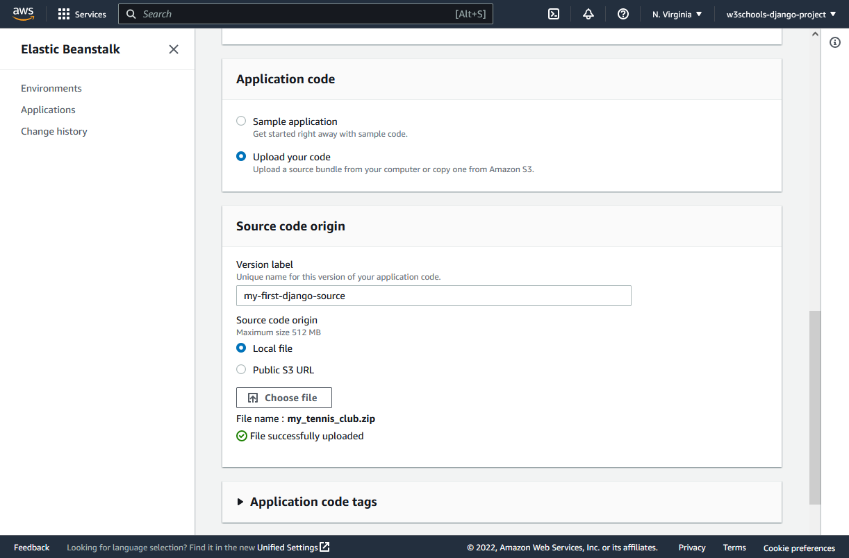 Next, scroll down to the next section, the "Application code" section, and choose "Upload your code".