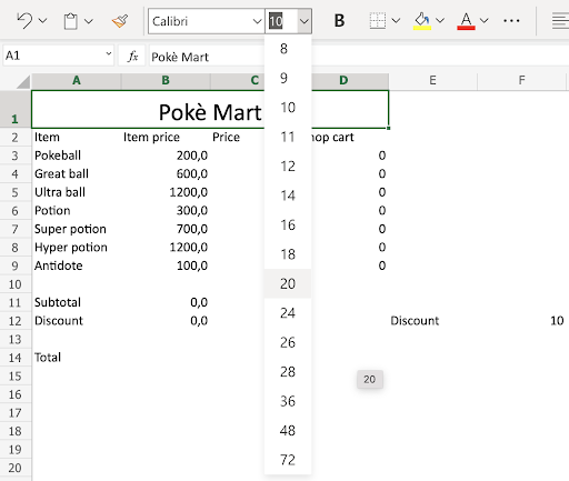 Type Poke Mart in the merged range A1:D1