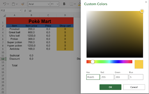 Note: Coloring the input fields can be helpful for those who will use the spreadsheet. In this case we marked the input fields with the yellow color: ffcb05.