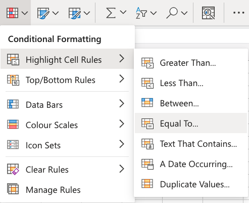 Here is the Highlight Cell Rules part of the conditional formatting menu:
