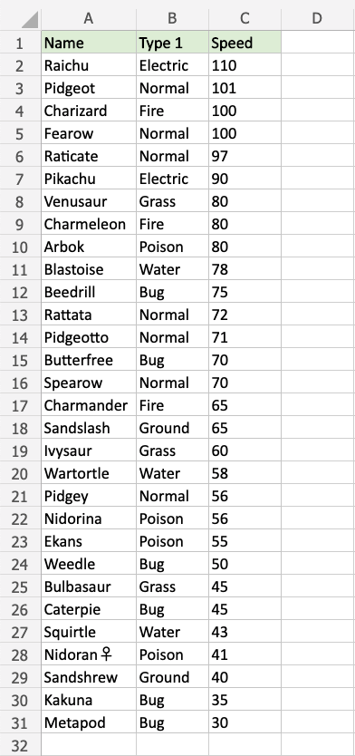 We can see that both Pidgey and Nidorina have a Speed of 56. So, they are tied for the 10th bottom value.