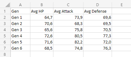 The outcome is this chart which has Bulbasaur evolutions on the horizontal axis.