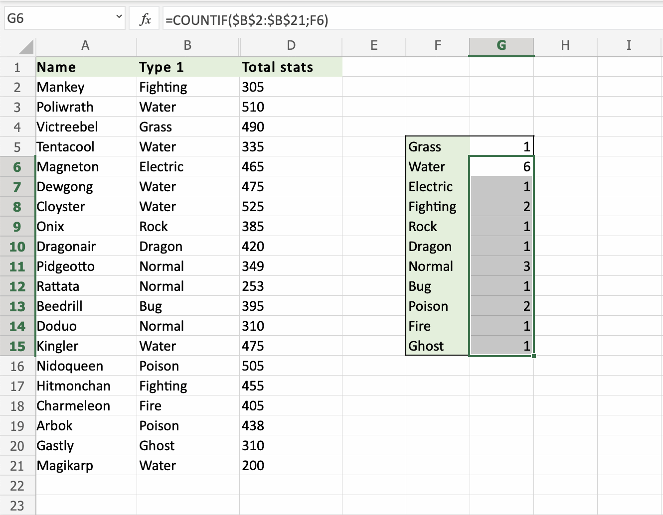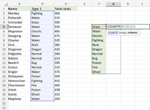 We want the COUNTIF function to count the types of Pokemons, in the range G5:G15:
