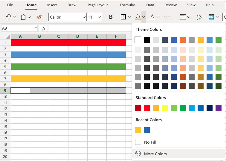 A9:F9 - Open color options