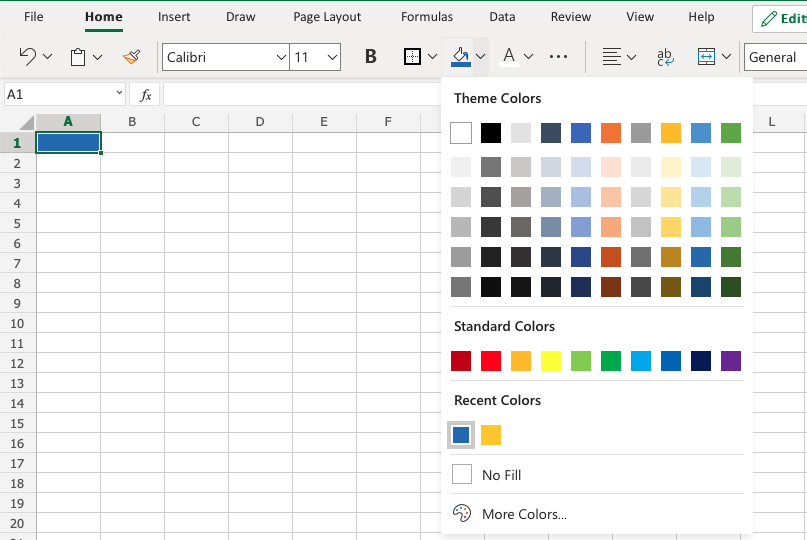 Excel has a set of themes and standard colors available for use. You select a color by clicking it: