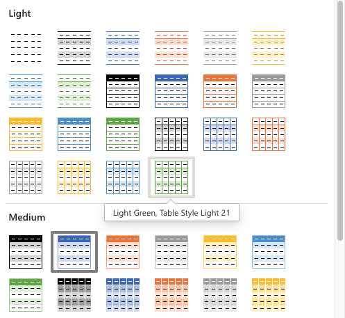 - Click on the Light, Green, Table Style Light 21. Found in the Light category.