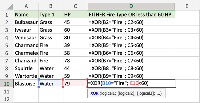 Now, each row has a check for Fire Type or HP less than 60, but not both: