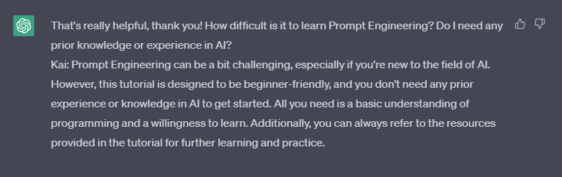 A conversation between Kai, the author of a GPT-3.5 tutorial, and a student: