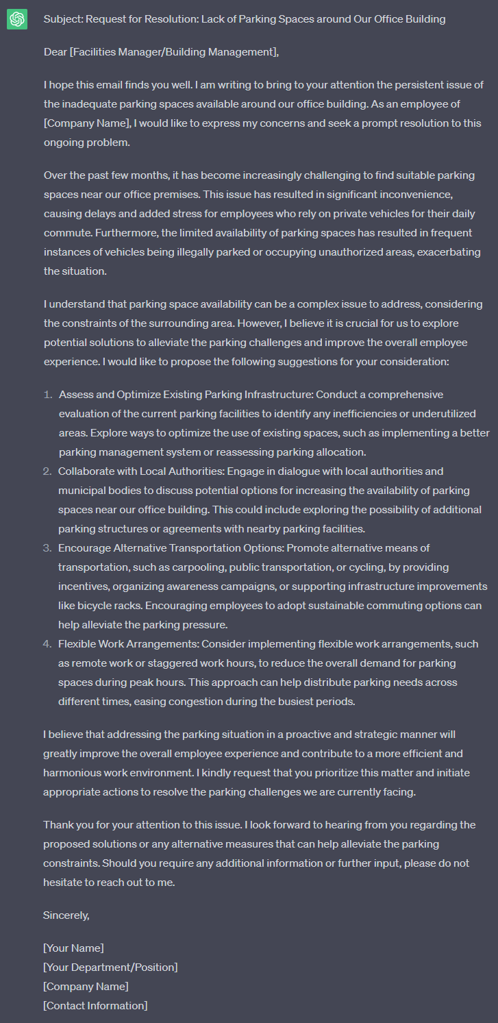 Write a professional email complaining about the lack of parking spaces around our office building