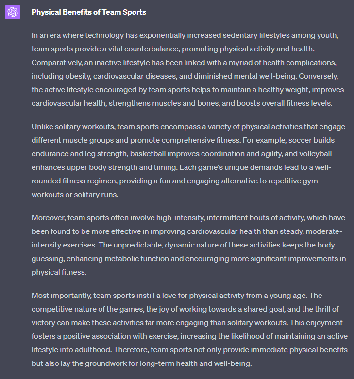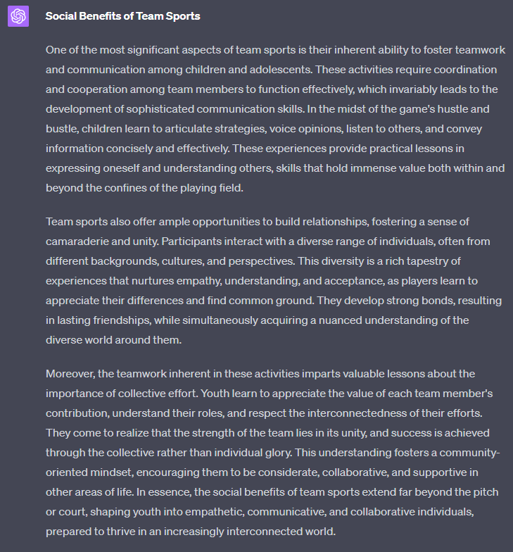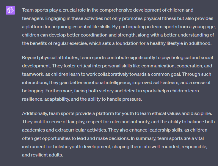 In our example, we will use the text 'For an article about "The importance of team sports for youth development", write a section about xyz' as a starting point: