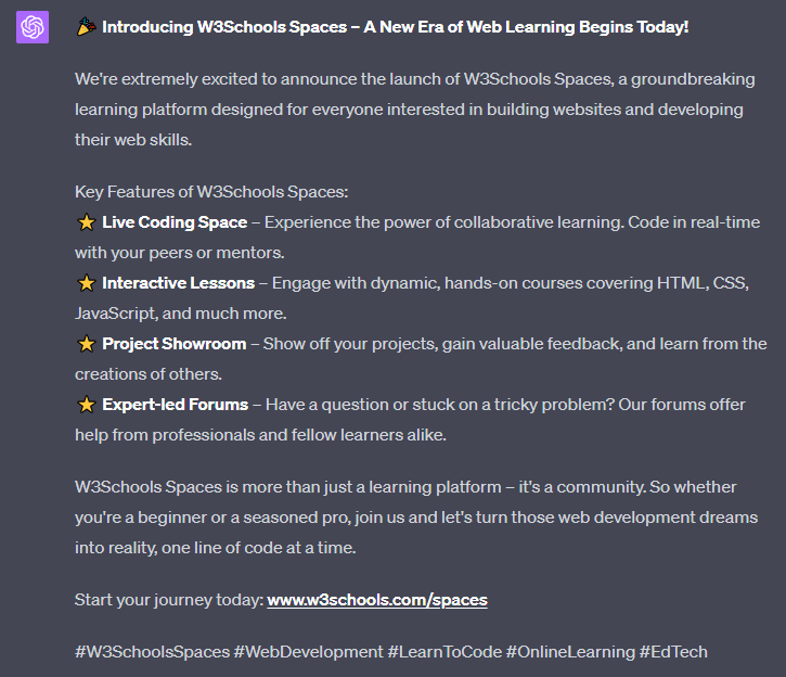 Create a Facebook post that announces "W3Schools Spaces" and its key features for people learning to build websites