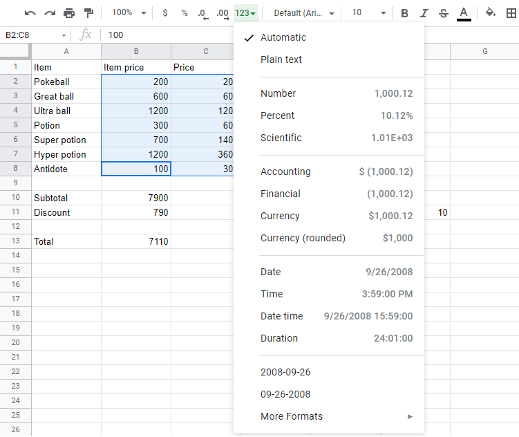 Number formats can be changed by clicking the Number format dropdown (