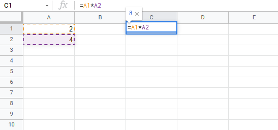 Lets change from addition to multiplication, by replacing the (+) with a (*). It should now be =A1*A2, press enter to see what happens.
