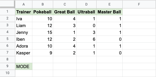 The MODE function is a premade function in Google Sheets, which is used to find the most common value(s).