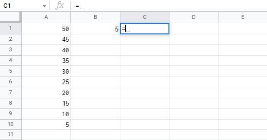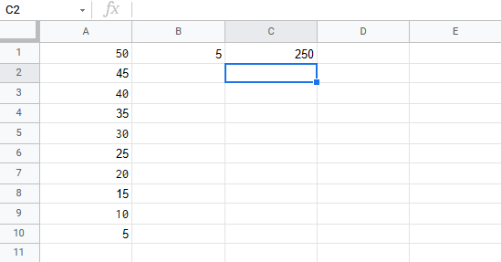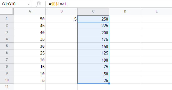 Let's have a look at an example where we multiply B1(5) with the range A1:A10 using absolute reference and the fill function.
