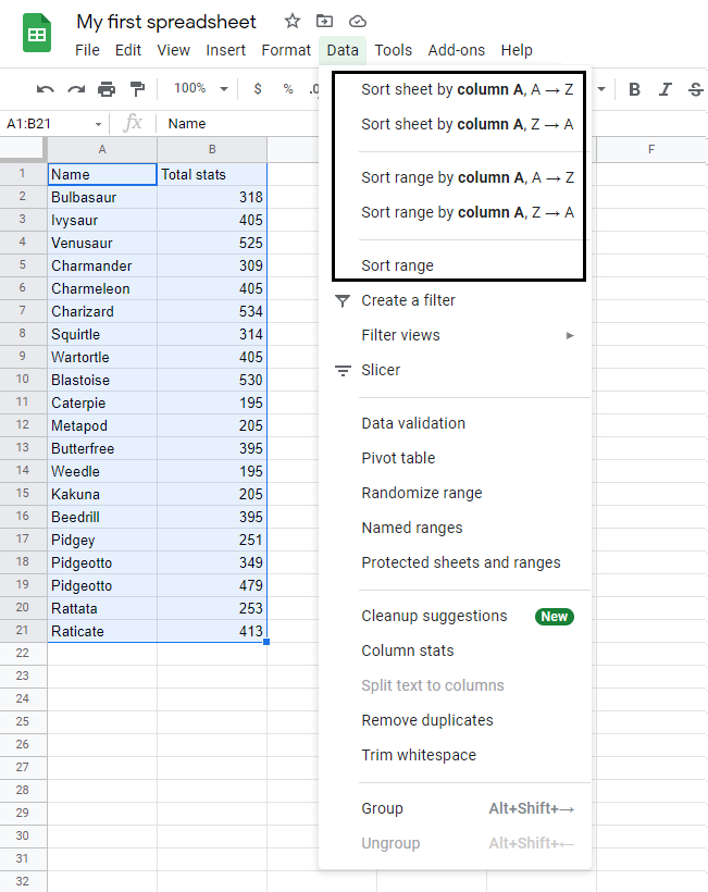 - Click on the Data menu and select Sort sheet by column A, A → Z