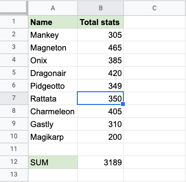 Great job! You have successfully calculated the sum of the stats using the =SUM function. The Pokemon's stats have a total sum of 3092.