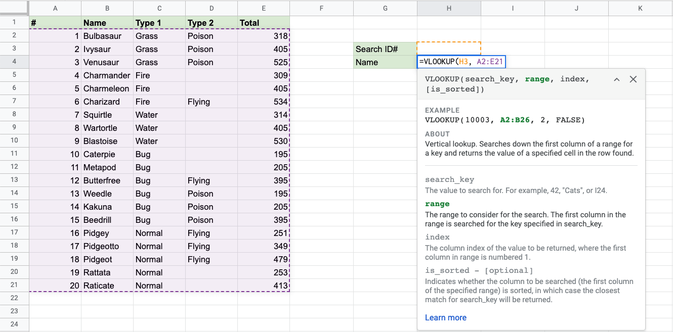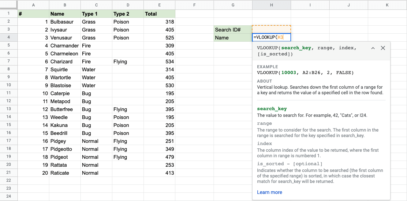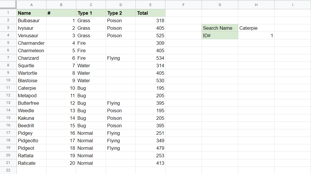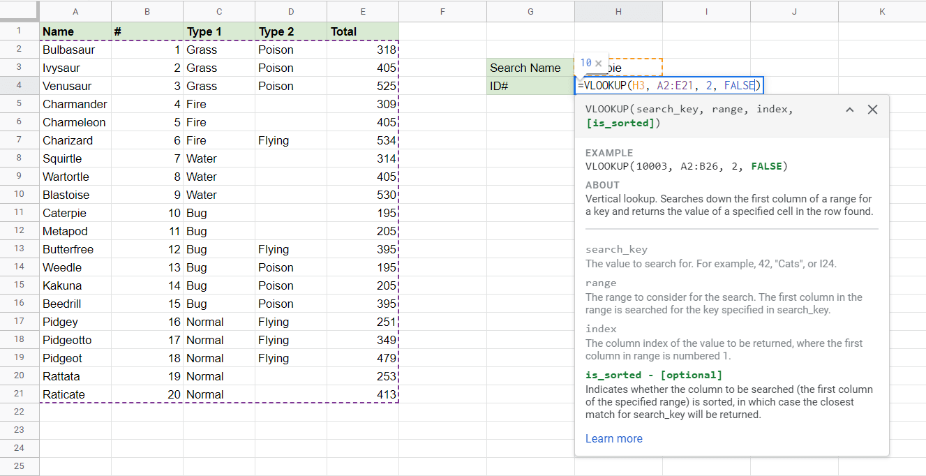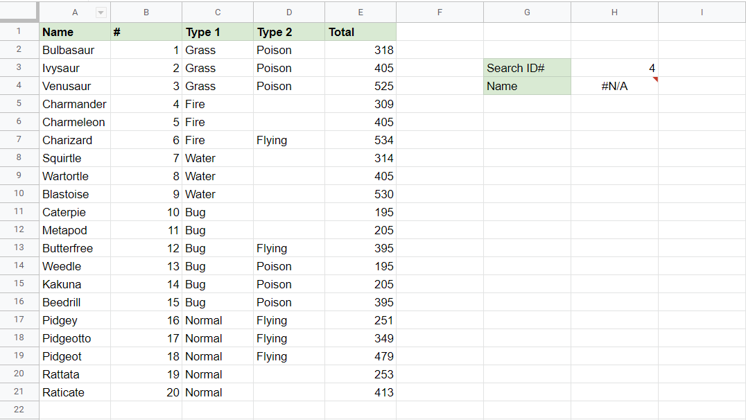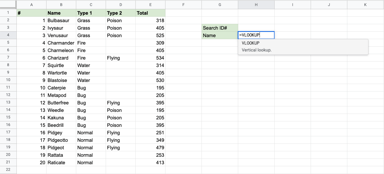 Let's switch the labels, and try to enter Caterpie into the cell H3, where the vlookup functions finds the search_key: