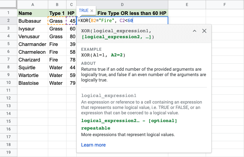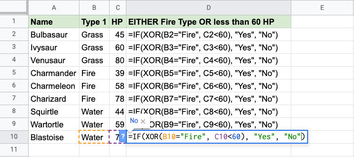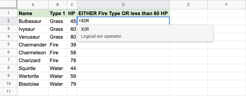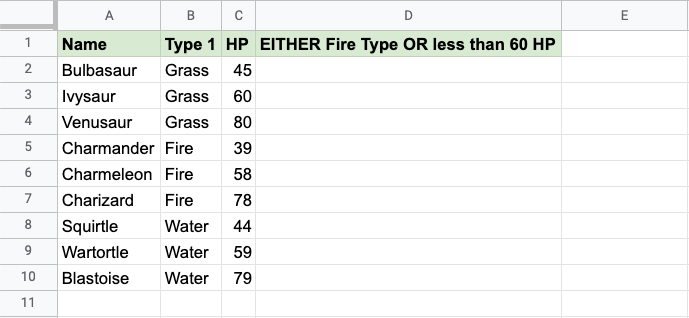 Now, each row has a check for Fire Type or HP less than 60, but not both: