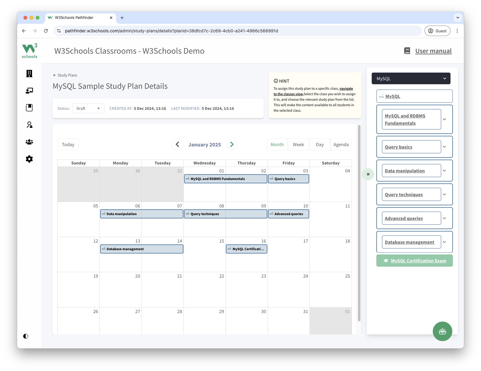 This study plan is a feature of W3Schools Academy.