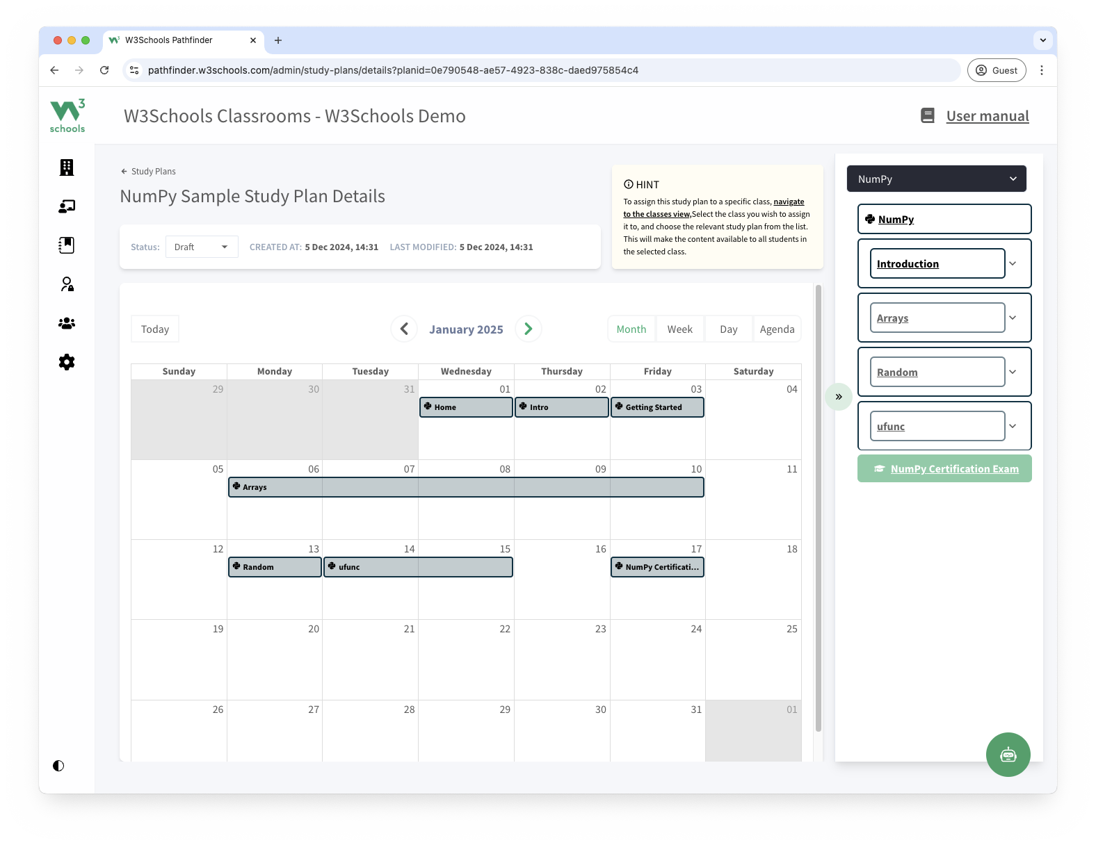 Save time with pre-built teacher materials and study plans. Easily organize your class with a timeline from the introduction of NumPy to the final exam.