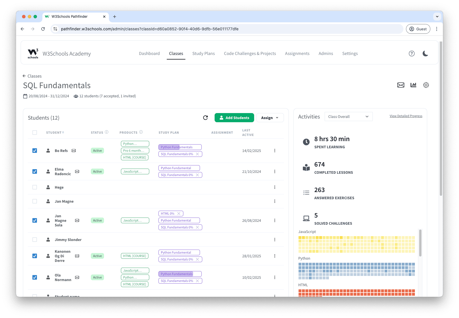 Organizations can track learner progress, get insights and manage everything from licenses to certificates with W3Schools Academy.